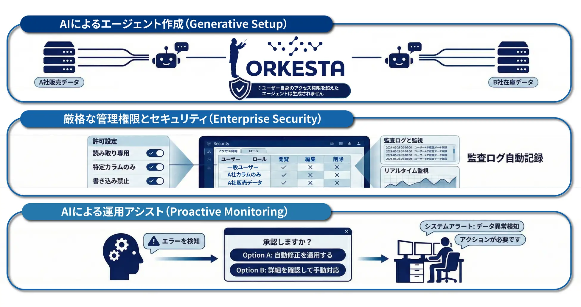 Orkestaは、AIエージェントによる「データ連携の自動化」に加え、エンタープライズ水準の「セキュリティ管理」を提供します。