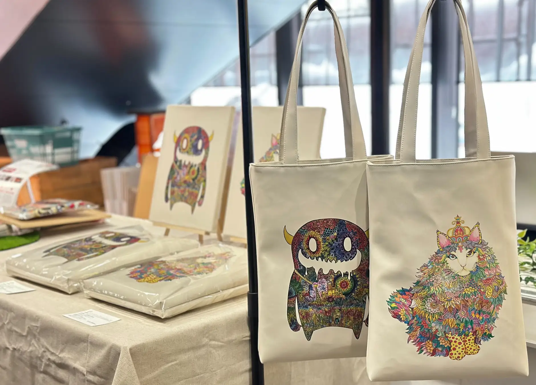 コラボ商品は、GOMA氏の代表的なデザイン「ムーンモンスター」「クラウンキャット」を、当社が開発・製造するりんご由来のバイオベースレザー「RINGO-TEX®︎(リンゴテックス)」に施したトートバッグ(2デザイン・数量限定)です。また、同素材を青森県十和田市の木製サッシメーカー・株式会社日本の窓の端材と組み合わせた新商品「アートパネル」のプロトタイプも先行展示いたします。トートバッグの縫製は、青森県八戸市の就労継続支援事業所「八戸グリーンプランツ」(運営:非営利型一般社団法人禾倫)が担当しており、福祉就労を通じたものづくりを実現しています。あわせて、昨年のねぶた祭期間中に好評を博した当社オリジナルのねぶたコラボ商品も再販いたします。